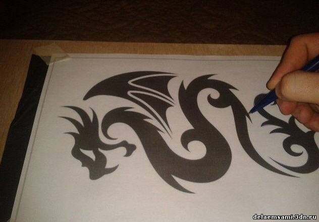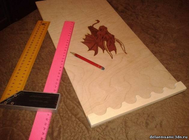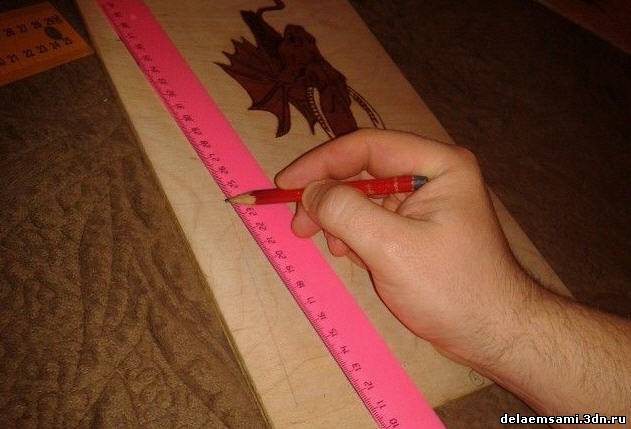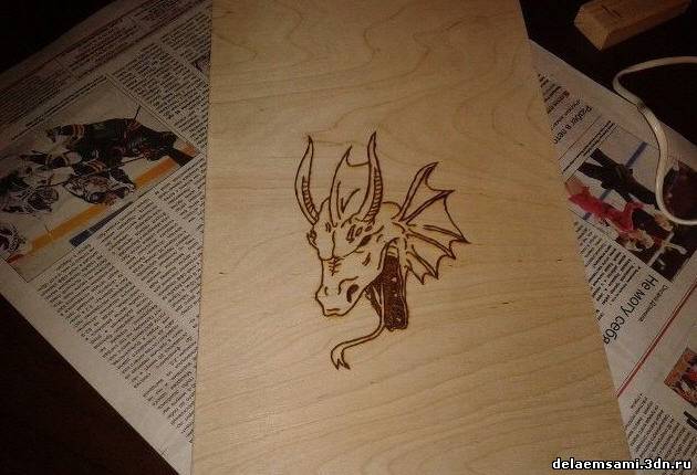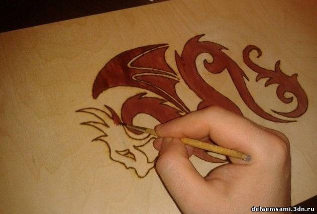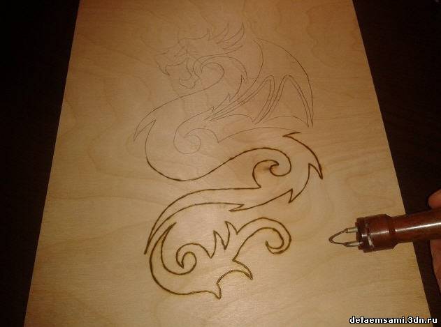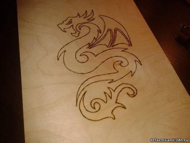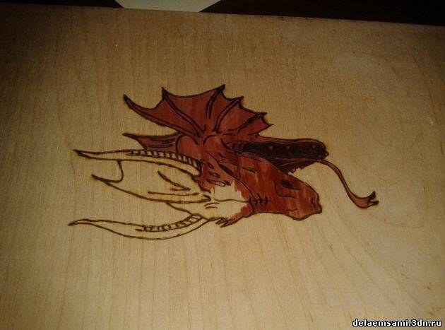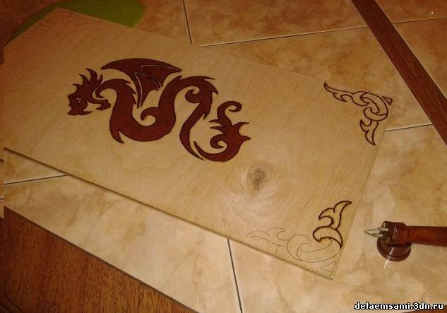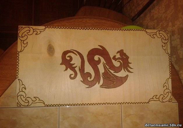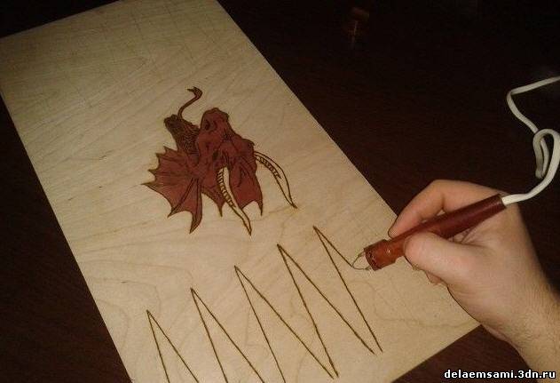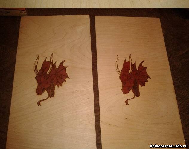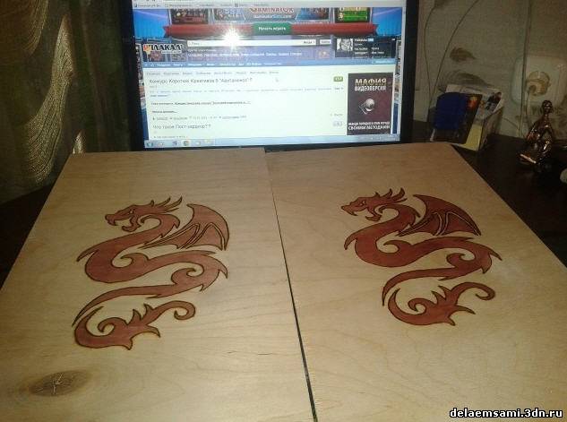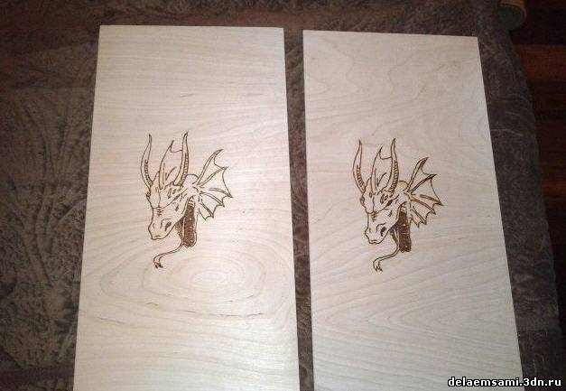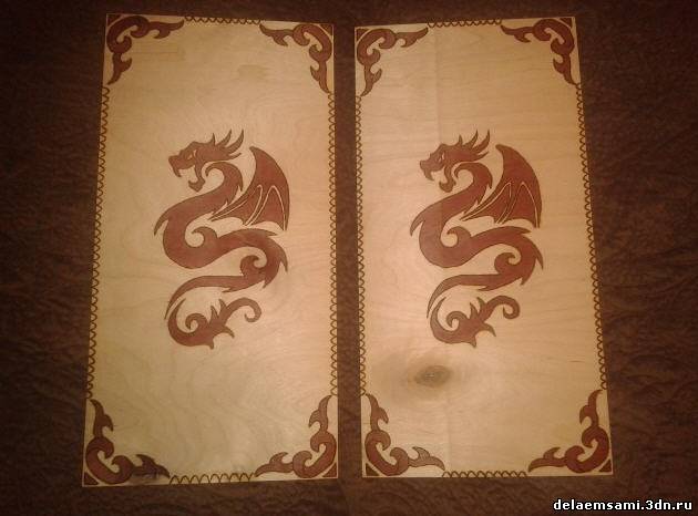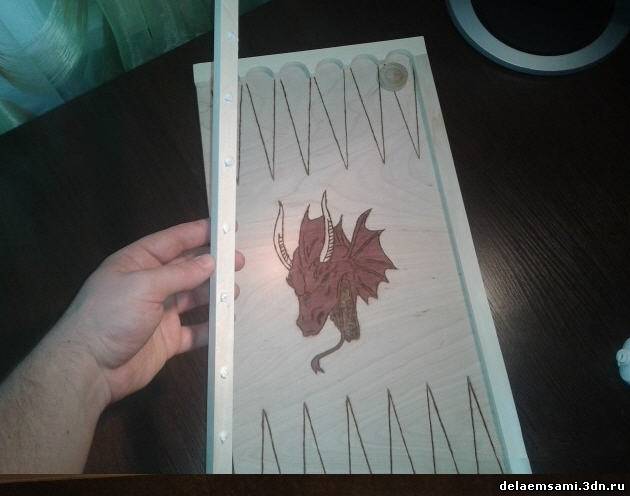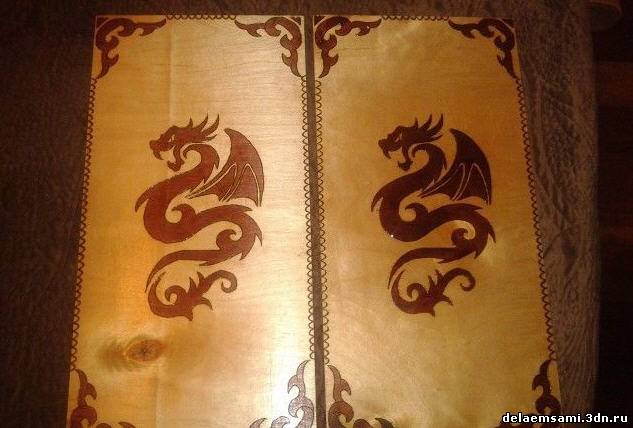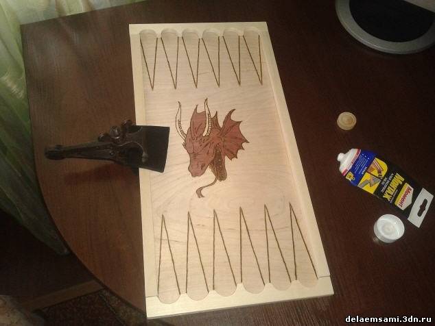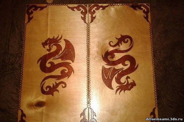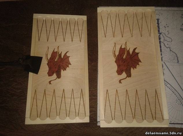 Нарды решил сделать с рисунками драконов. Размечаем и наносим через капирку рисунок "внутренней" стороны Далее принимаюсь за выжигание рисунка. Дело это довольно муторное и непростое (учитывая что я это делаю второй раз в жизни) Итак, выжигаем... Тоже самое проделываем со второй половиной доски. Получаем две одинаковые половинки. Тоже самое проделываем с "наружной" стороной Начинаем следующий этап - покраска "морилкой" в 2 слоя. Морилка была куплена спиртовая, т.к. на "водной основе" сильно махрит фанеру. Аналогично с "внутренней" стороной доски Продолжаем оформление "наружной" стороны. Для полного завершения образа добавляем углы и рамку Покраска морилкой в 2 слоя И покрытие лаком также в 2 слоя Теперь самое сложно на мой взгляд. Т.к. моя квартира лишена фрезерных и токарных станков, все пришлось вырезать вручную. Сначала подготавливаем рейки. Отрезаем необходимую длину (все согласно чертежа) Размечаем будущие пазы для фишек Сверлим Далее аккуратно, очень острым ножом выбираем пазы Таких реек изготавливаем 4 штуки. Процесс доводки и полировки не запечатлелся, т.к. руки 2 и обе были заняты. Начинаем размечать игровое поле. И выжигаем Начинаем приклеивать все элементы, предварительно подогнав все по длине и ширине. Внутреннюю сторону покрываем лаком в три слоя ( для прочности покрытия) Теперь необходимо установить петли, чтобы нарды складывались. Снова очень аккуратно и очень острым ножом выбираем паз для петли. Примеряем - подходит. Замечаем отверстия, собираем на саморезы. Из найденного букового бруска по просьбе токаря были выточены фишки Ага, вот и заветная морилочка... И... 15 из 30 фишек превращаются и "белых" в "черные" Собранная наружная сторона Собранная внутренняя сторона. К чемпионату готов. Первый ход 5/4. У меня все. Всем спасибо за внимание!