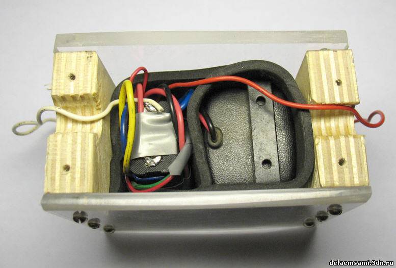 Аккуратно соберем схему, скрепим изолентой (что бы от ударов ни один проводок не отвалился), обернем пористым материалом (например полоской материала от коврика для мыши) и поместим в корпус. Напротив сирены сделаны отверстия.